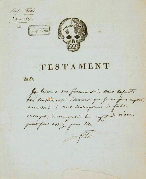 Son testament philosophique, trois feuillets rédigés manuellement et signés, datés 7 mai 1817 avec le cachet de la loge la « Parfaite Union » à Douai vendu chez Drouot le 18 avril 2014 marque une réelle modestie, mais il s’agit là du caractère qu’impose l’exercice.