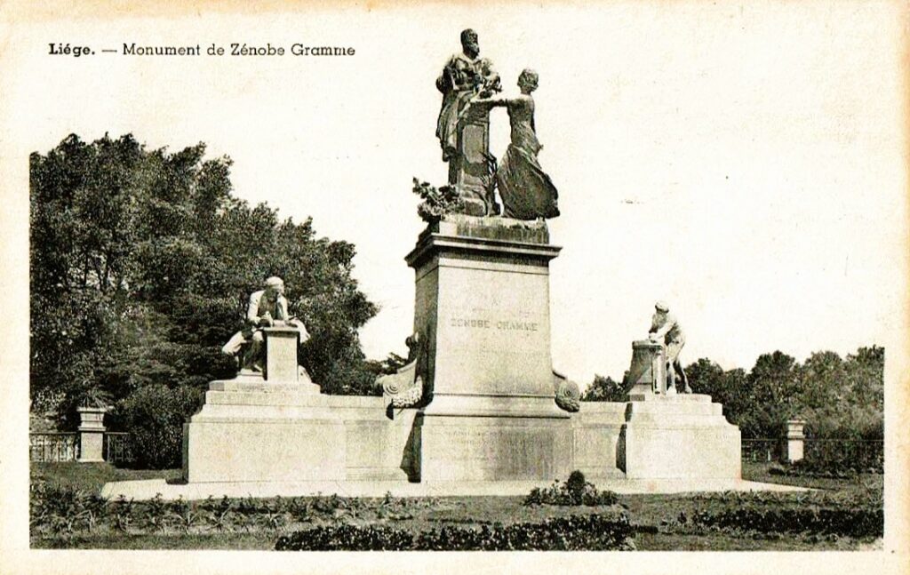 Il y a aussi les monuments, innombrables, dont le plus imposant est sans doute celui qui est posé à Liège, il est l’œuvre du sculpteur belge Thomas Vinçotte et de l’architecte liégeois Charles Soubre. Il a été inauguré le 7 octobre 1905, dans le cadre de l’Exposition universelle de Liège. Il est à la mesure du génie attribué à Zénobe Gramme puisqu’il comprend trois groupes de sculpture. La partie centrale, en bronze, s’appuie sur un socle en pierre de très grande largeur: la main de Zénobe Gramme repose sur une dynamo bien visible. Une femme se tient à la droite de l’inventeur ; elle tient les palmes glorieuses et « les foudres électriques ». Cette partie centrale n’est pas sans rappeler son monument funéraire, au cimetière du Père Lachaise, où une statue de bronze de Mathurin Moreau représente Gramme tenant dans sa main gauche l’anneau de sa dynamo, et dans sa main droite, un compas, outil du menuisier, en référence à ses premières passions. A gauche, Gramme menuisier; à droite, Gramme méditant, vingt ans plus tard.