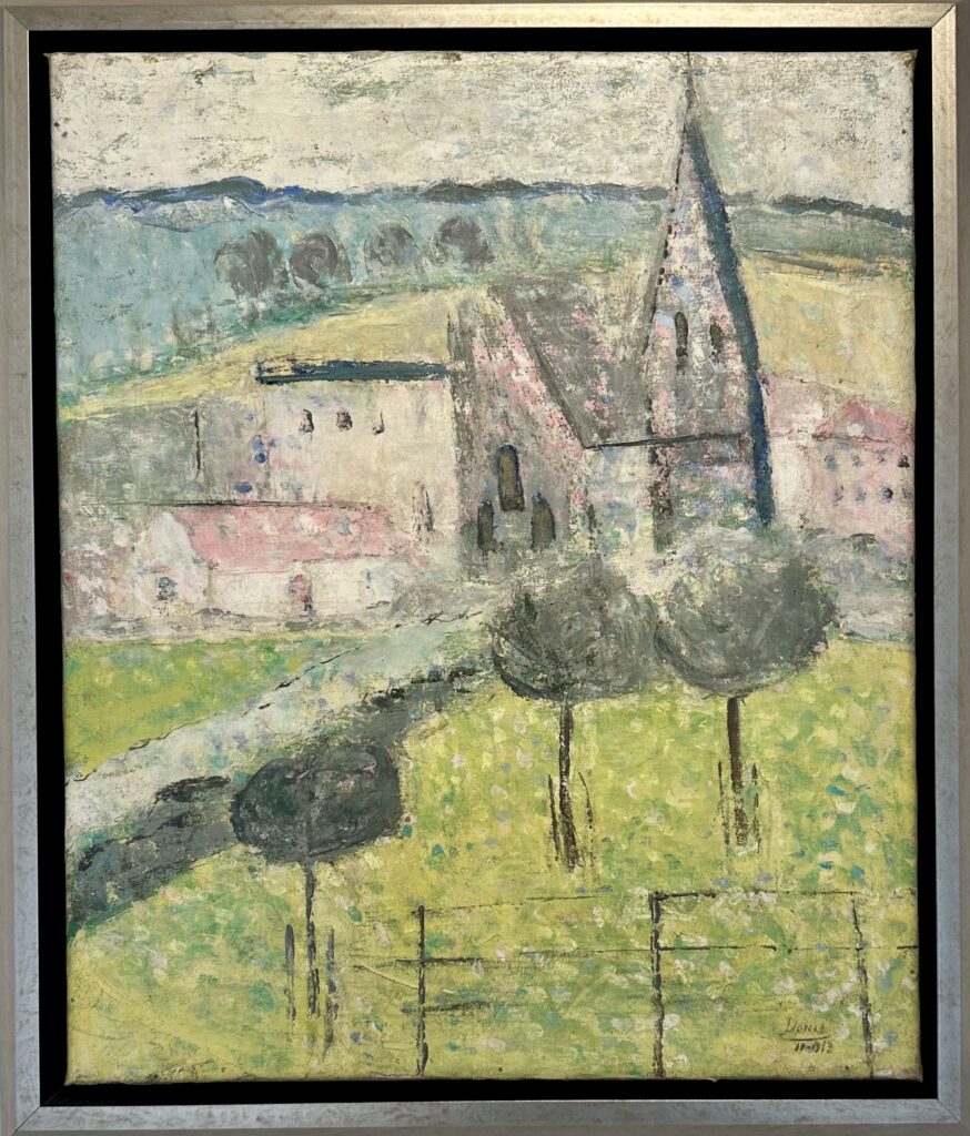 Je m’y laisse influencer par le charme du paysage wallon qui est très beau et ma peinture s’en ressent … Je retourne au figuratif mais très stylisé et synthétisé, avec des retours au cubisme.