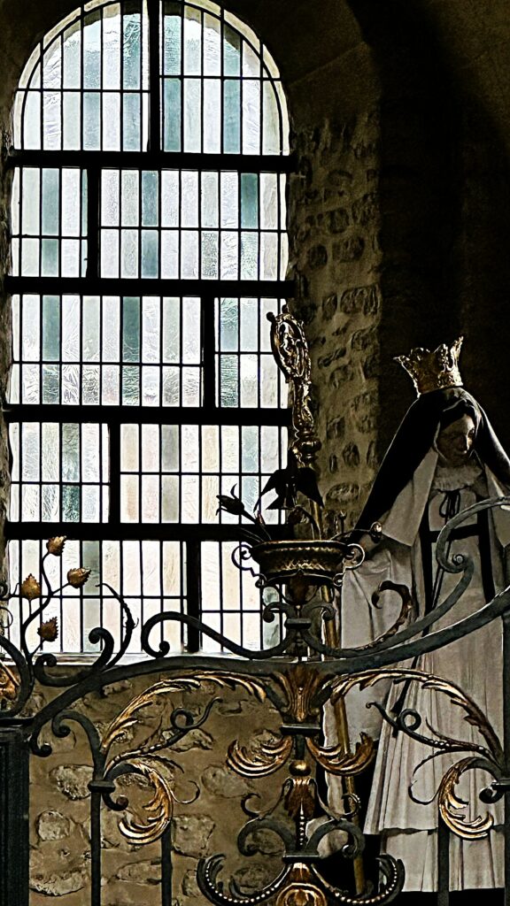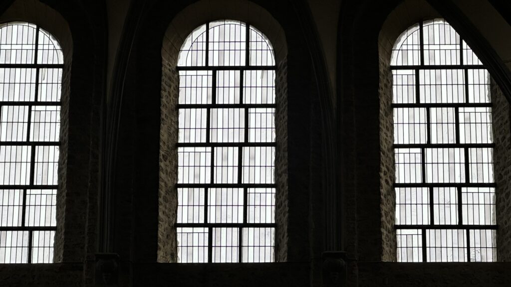 C’est en somme la même intention qui a valu à Nivelles. Rappelez-vous, on a vu que la priorité y était de valoriser la pierre et d’éviter une concurrence du vitrail ou une colorisation par la lumière, traversée par le vitrail, qui dénaturerait la pierre. Quant aux plombs, ils deviennent élément graphique, entrant dans la composition, au-delà de leur fonction d’assemblage.