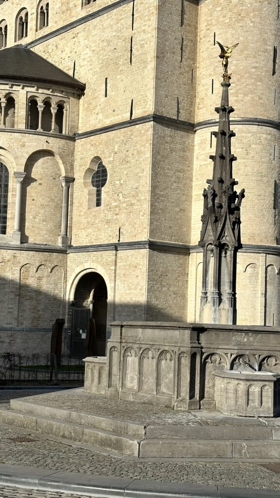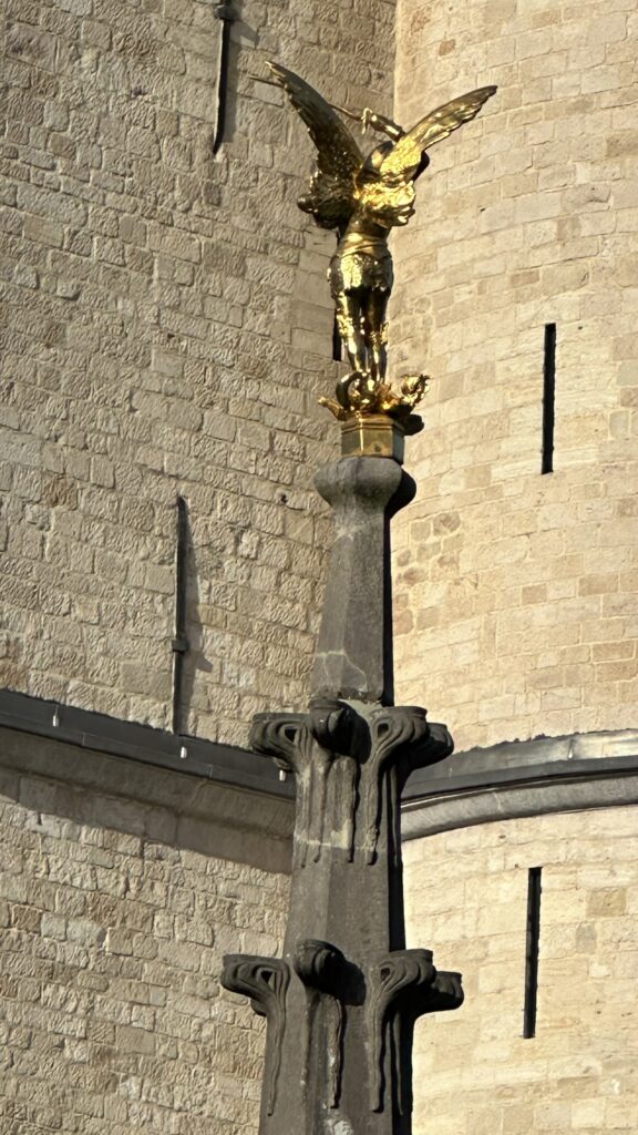 Enfin, tout à côté de la Collégiale, on trouve une fontaine qui constitue sans doute un des ronds-points patrimoniaux les plus remarquables de la région. On la doit à l’abbesse Adrienne de Moerbecq. Saint-Michel la couronne, qui a pris la place de l’archiduc Albert, le premier à avoir eu sa statue en haut de la fontaine publique du centre-ville…